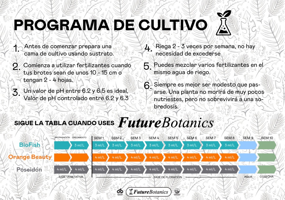 Nuestro programa de cultivo está diseñado para simplificar tu proceso y maximizar tus resultados. Con la combinacion perfecta de BioFish, Orange Beauty y Poseidón, Tendrás una guía práctica desde la fase vegetativa hasta la cosecha